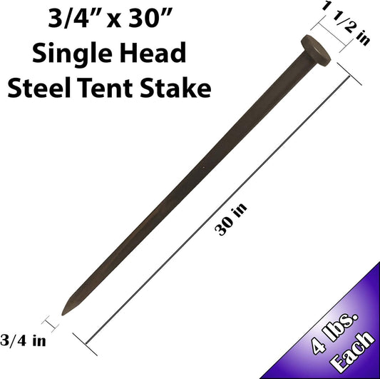 Single Head Metal Tent Stakes Heavy Duty Steel Ground Stake, Versatile Spikes to Anchor Commercial Inflatables, Event Party Tents, and Outdoor Camping Shelters, 3/4 X 30 Inch, 4 Pack