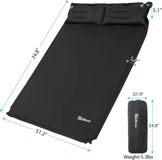 Double Camping Sleeping Pad Self Inflating Camping Mattress with Pillows 2 Person Camping Bed for Backpacking Black